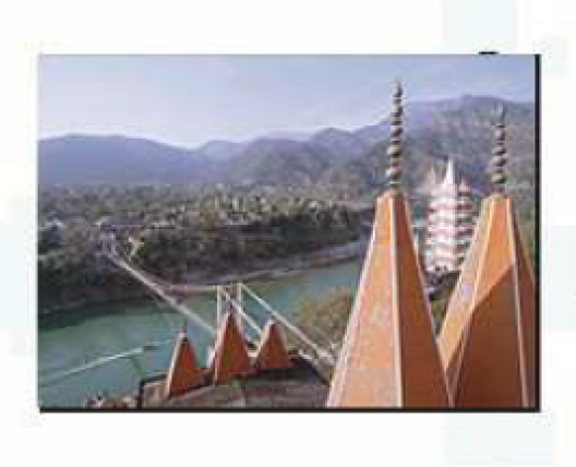 Rishikesh India, 1968. Rishikesh is on the Ganges river, 1,220 feet up in the foothills of the magnificent Himalayan mountains. Here I wanted to visually connect the foothills, Rishikesh on the far side of the Ganges, and two temples in the foreground, taken from the roof of one of the temples.
