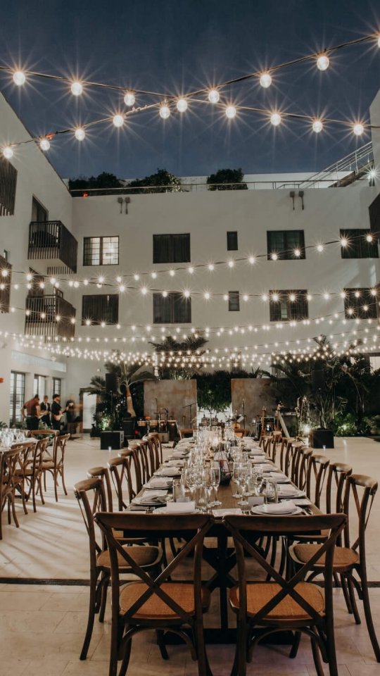 If a courtyard is the home of intimate celebration, our home – lush greenery, bistro lights, limestone flooring – feels like an Italian palazzo