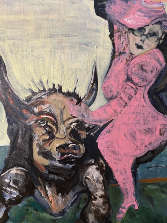 BULL RIDE- reframes the mythic “Rape of Europa,” the story immortalized in a painting by the famed Venetian artist Titian painted (ca. 1560–1562). In the myth, the god Zeus assumed the form of a bull and enticed the beauty Europa to climb onto his back. Once there, the bull rode into the sea and carried the maiden to Crete where he revealed his true identity. Here the lady is in charge, having tamed the bull.